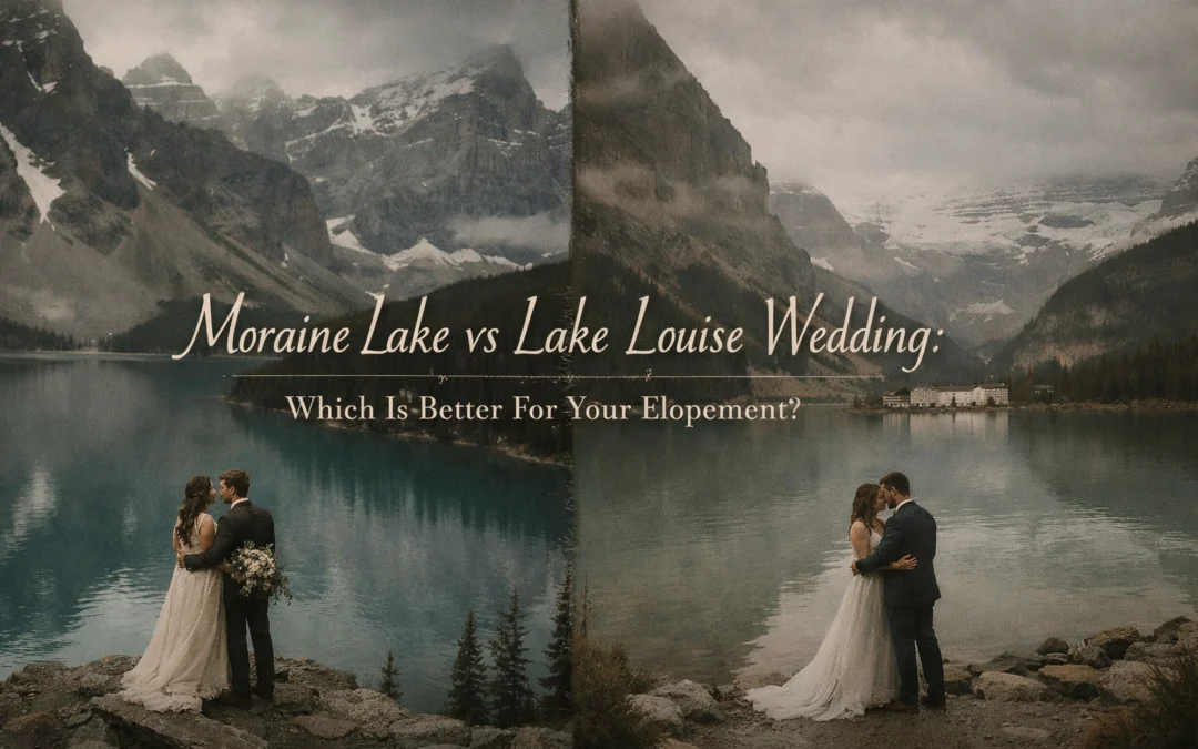 Choosing between Moraine Lake and Lake Louise for your elopement isn’t just about picking a pretty backdrop: it’s about matching your wedding vision to the right mountain setting. Both locations offer those iconic turquoise waters and dramatic peaks that make Banff a world-famous elopement destination, but they deliver completely different experiences.